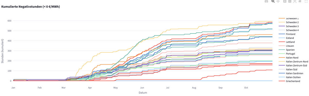 Según un análisis de la herramienta Strommarkt-App, la duración de los periodos de precios negativos ha aumentado drásticamente en todo el continente, debido a que el auge de la generación renovable y las fluctuaciones climáticas ejercen presión sobre los sistemas eléctricos europeos. A finales de octubre, la segunda zona de precios de Suecia registró el mayor número de horas con precios negativos, con 593, seguida de los Países Bajos (584), Alemania (576), España (569), Bélgica (519) y Francia (513).
