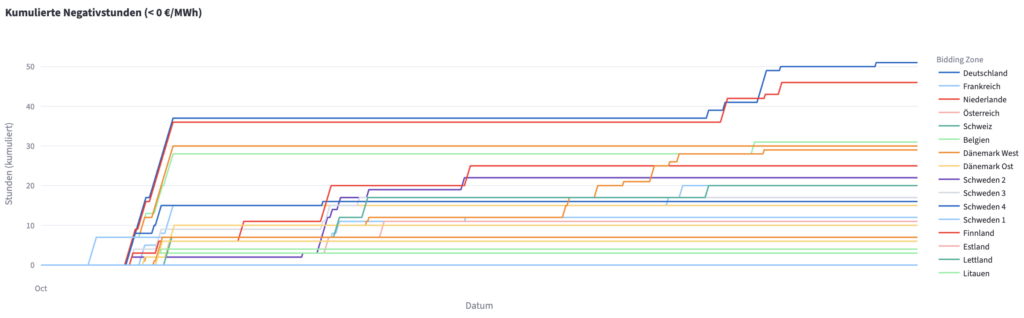 Solo en octubre, Alemania registró el mayor número de horas con precios negativos en la Bolsa Europea de Energía (51 horas), seguida de los Países Bajos (46 horas), Bélgica (31 horas) y Dinamarca Occidental (30 horas). España y Finlandia también superaron la media mensual europea de unas 19 horas, con 29 y 25 horas respectivamente.
