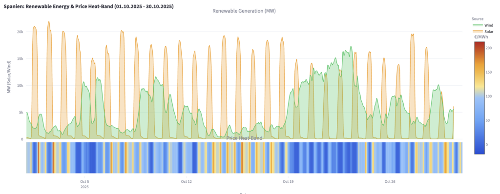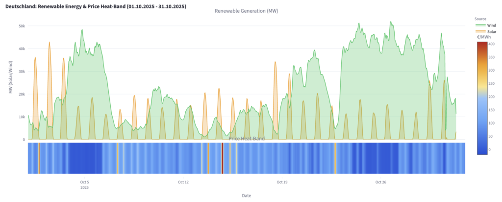 La principal causa de los precios negativos de octubre fueron probablemente las tormentas otoñales, más que la sobreproducción solar. No obstante, la generación solar en Alemania alcanzó su punto máximo en 43 GW El 2 de octubre. Incluso al mediodía de ese día, los precios de la electricidad se mantuvieron en 65 €/MWh (75 $/MWh) — una cifra relativamente sólida, según los operadores del mercado.